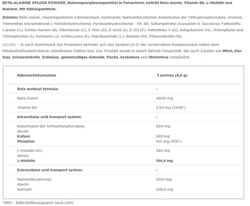 ein Nahrungsergänzungsmittel in Pulverform, das sich durch eine hervorragende Löslichkeit, eine ausgezeichnete Aufnahmefähigkeit von Wirkstoffen und einen sensationellen, erfrischenden Geschmack von Orangen auszeichnet. Sogar 1600 mg hochwertiges Beta-Alanin in jeder Portion (3,2 g) Unterstützung bei der Verringerung von Müdigkeit (Vitamin B6) Hilfe bei der Erhaltung eines normalen Energie-, Eiweiß- und Glycogenstoffwechsels (Vitamin B6) Beitrag zu einer normalen Funktion des Nervensystems (Vitamin B6)