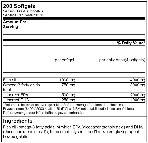 ?? Deine Vorteile auf einen Blick 1000 mg hochwertiges Fischöl pro Kapsel 750 mg reine Omega-3-Fettsäuren 500 mg EPA + 250 mg DHA (2:1 Verhältnis) 75 % Omega-3-Konzentration Natürliche Triglycerid-Form Laborgeprüfte Reinheit Made in Germany 200 Softgels – bis zu 200 Tage Vorrat