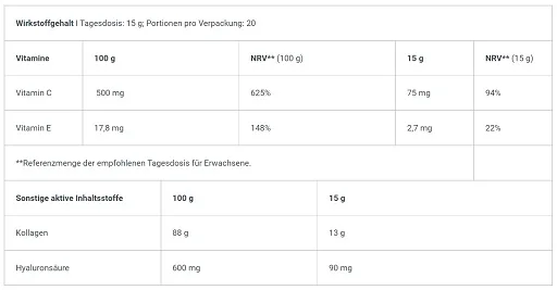 13 g Collagen pro Portion mit Vitamin C und Vitamin E mit Hyaluronsäure laktose-, gluten- und zuckerfrei